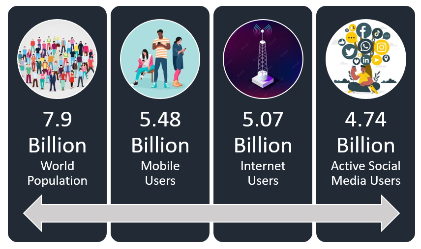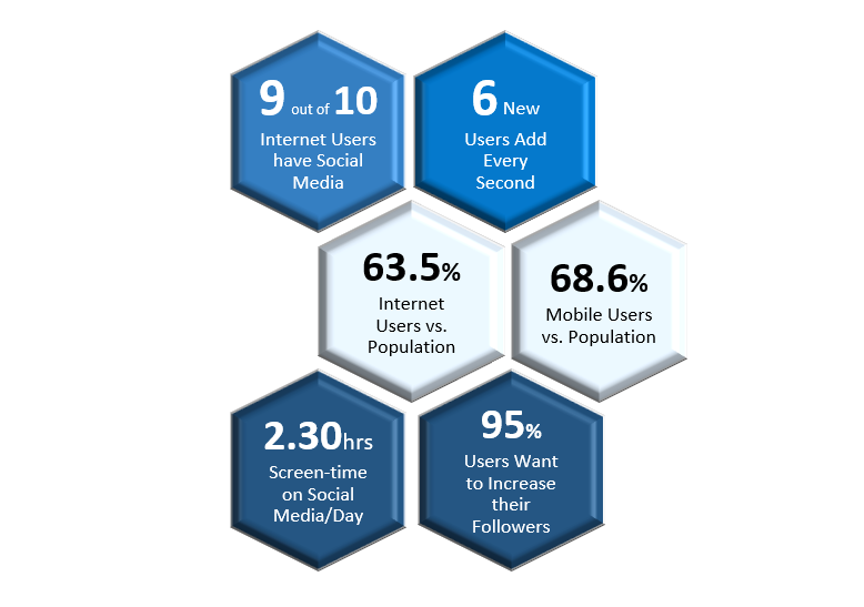 9 out of 10 internet users have a social media account and let us tell you this exciting fact since you started reading this blog, 300 new accounts have been created on social media. At an average rate of 6 new users per second, the y-o-y growth rate is 4.2%. A user's average screen time on social media is 2.30 hrs per day. If we compare with the total population, we find that 68.6% of the world population uses a mobile phone, whereas 63.5% of the population has internet access.